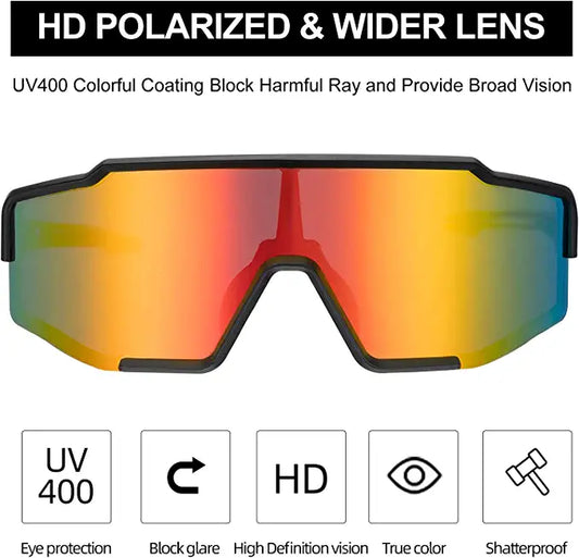 UV400 PROTECTION: 100% UV400 protective for this sports sunglasses. Which is good for keeping lens clear. In daily use, our glasses can provide a more enjoyable cycling experience.DURABLE FRAME: Full frame design with PC memory material, cycling sunglasses has great durability, combine with high-quality lens can protect your eyes from strong impact.POLARIZED LENS: ROCK BROS polarized lens can show the most reality and colorful world to you. Increasing contrast and deepening perception, thereby protecting your eyes perfectly, ideal for partly cloudy to sunny conditions, also good for cycling, fishing, running, climbing, etc.CURVE & WIDER DESIGN: Wider lens can not only provide more bigger field of vision, also more windproof, Curve design lens have low air resistance which is suitable for high-speed riding.